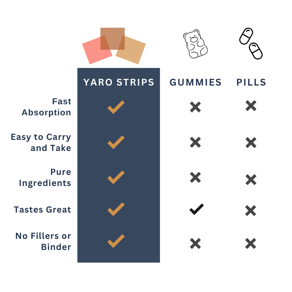 Unlike gummies, pills, or drinks that must pass through your entire digestive system and take forever to kick in, our strips dissolve instantly on your tongue. This allows for the active ingredients to directly absorb into the body, delivering faster and more effective results.